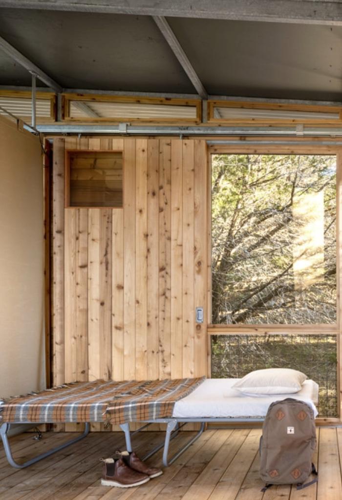 Each shelter is named for an animal and is grouped by Land and Sky neighborhoods. All shelters include full-size cots with viny! mattresses, roll-down canvas dividers, storage cubbies, an overhead fan, many floor-to-ceiling screens that can be covered by barn doors with windows.